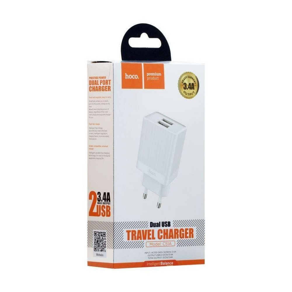 Φορτιστής ταξιδιού Hoco C51A Prestige Power Fast Charging 5V/3.4A λευκός με διπλή θύρα USB για ταυτόχρονη φόρτιση συσκευών όπως κινητά τηλέφωνα, μουσικές συσκευές, GPS, bluetooth ακουστικά κτλ. και πολλαπλή προστασία κυκλώματος. Input: AC100-240V 50/60Hz 0.5A και οutput: USB 1/2: 5V/3.4A.